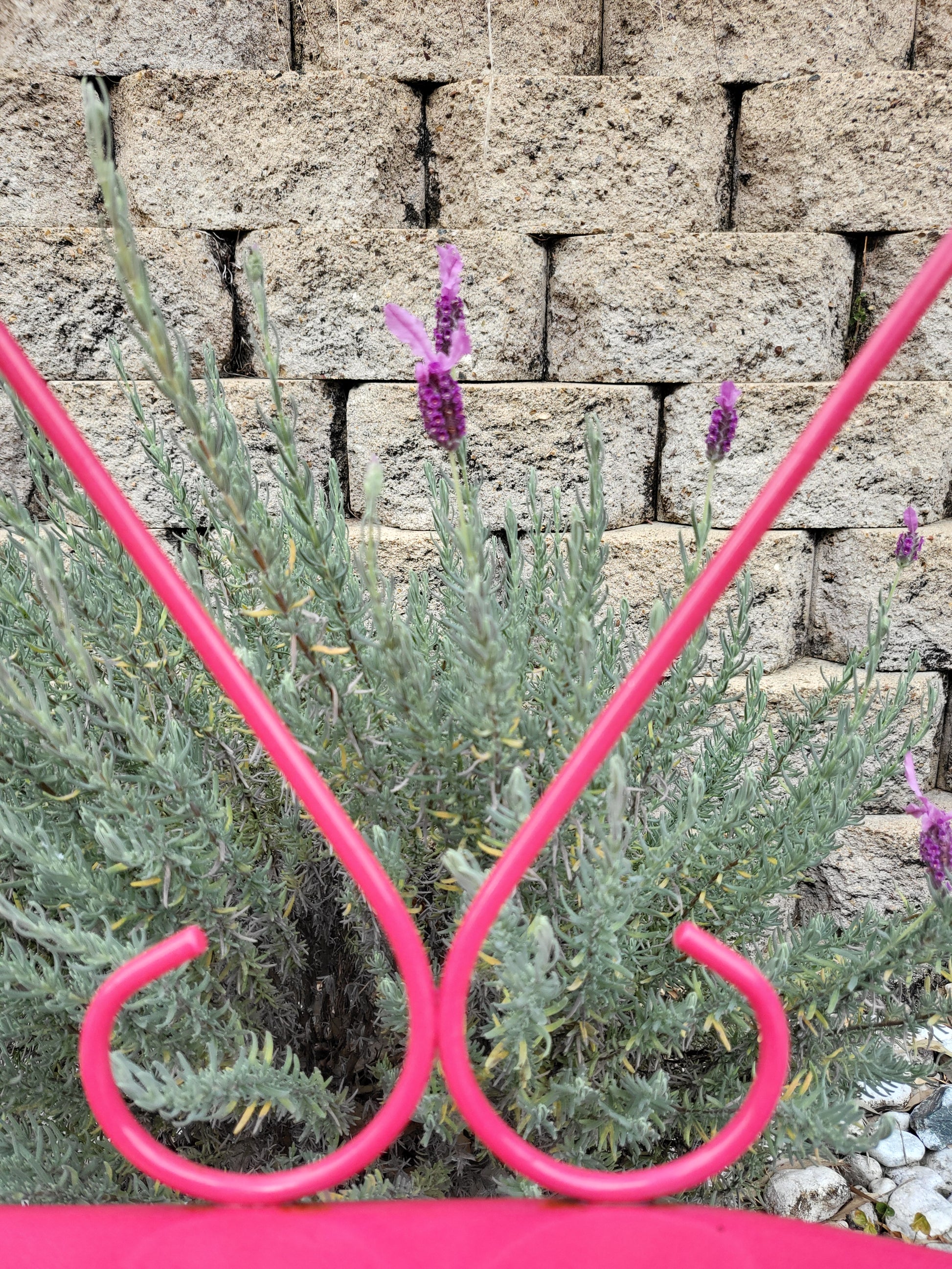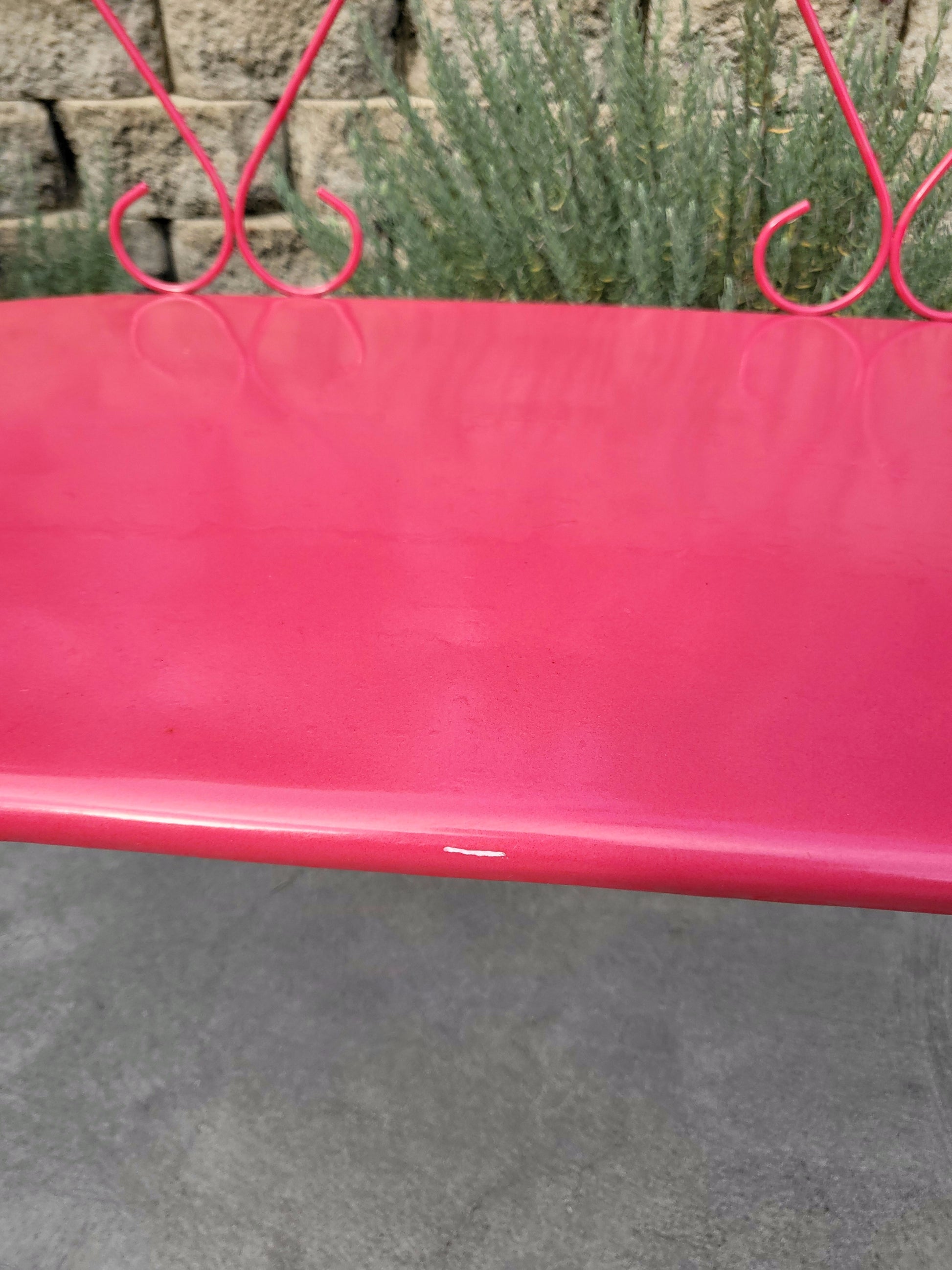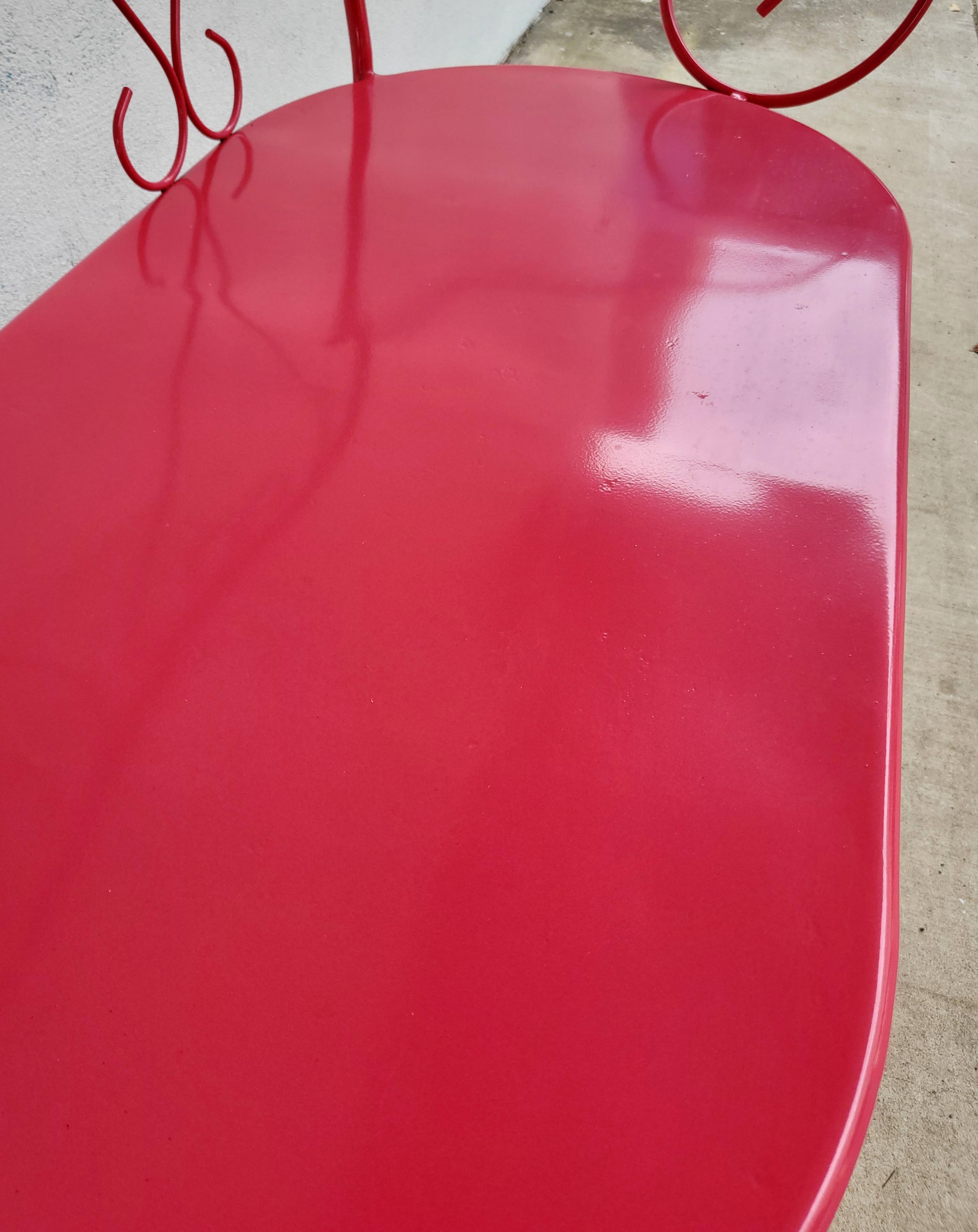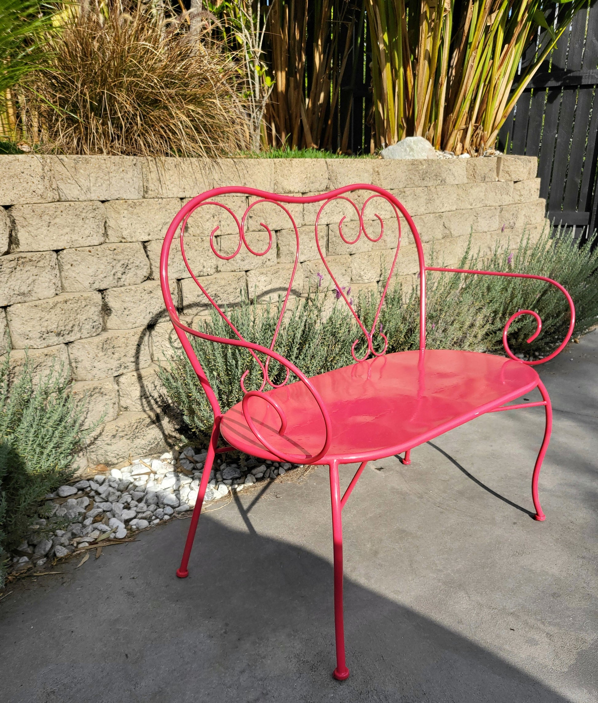 Its elegant wrought-iron frame, complete with whimsical heart-back detailing, has been freshly powder-coated in a vibrant pomegranate hue - a bold yet timeless statement for your garden or entryway.