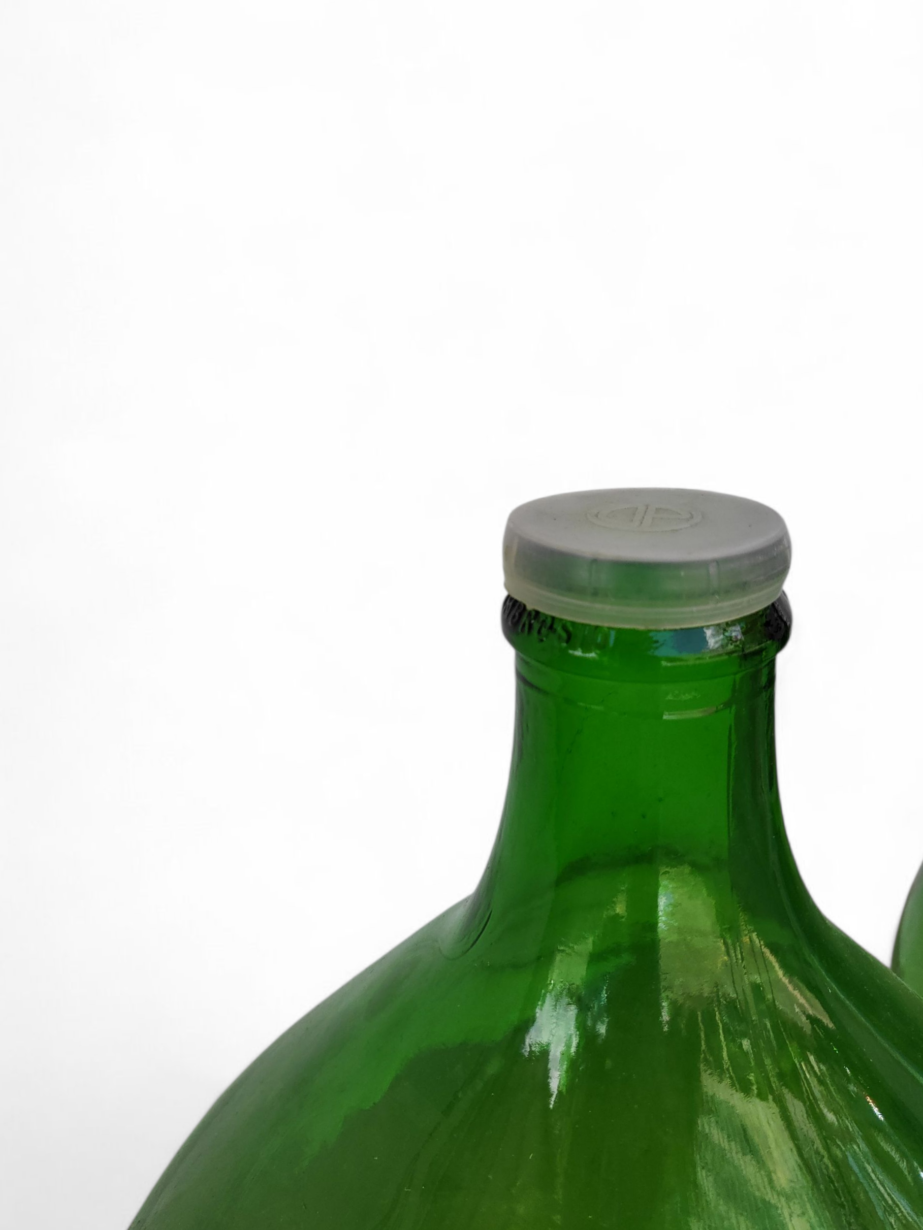 Italian green glass demijohns, also known as "damigiana" or "carboy," are large, rounded glass vessels traditionally used for fermentation, aging, and storing beverages such as wine, cider, and vinegar.