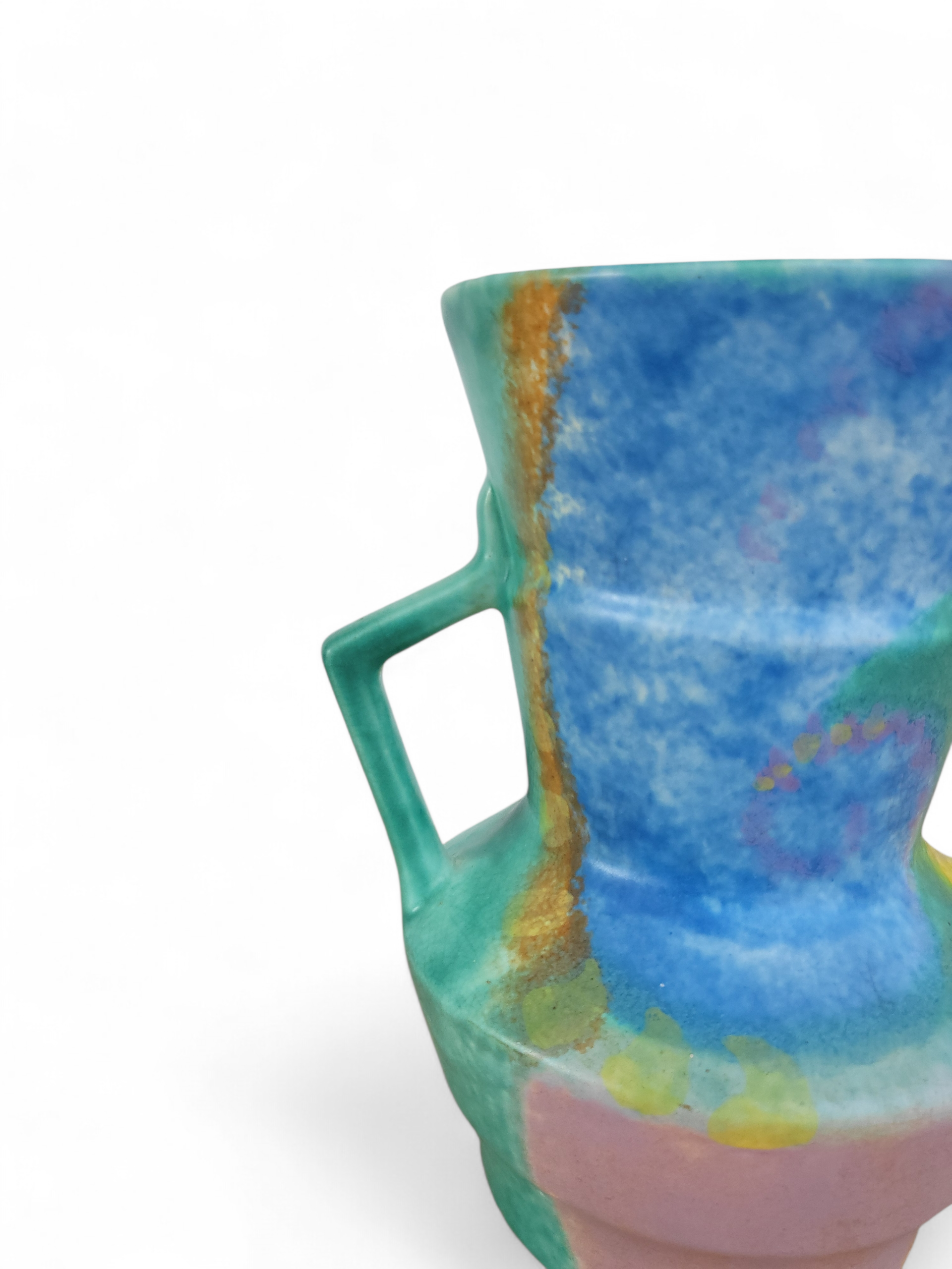 This example features a painterly composition of cobalt and turquoise blues to the front, with contrasting green tones to the reverse, softened by yellow and blush accents around the body and base. The angular twin handles and gently waisted profile are characteristic of Beswick’s mid-century experimentation with form, bridging functional pottery and decorative art.