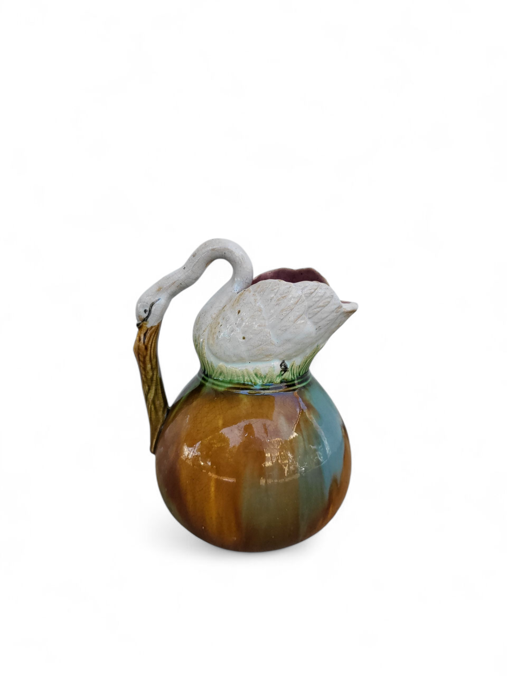 A rare and early example of English Majolica pottery, this hand-glazed jug features a sculptural swan gracefully curving over the rim to form the handle.