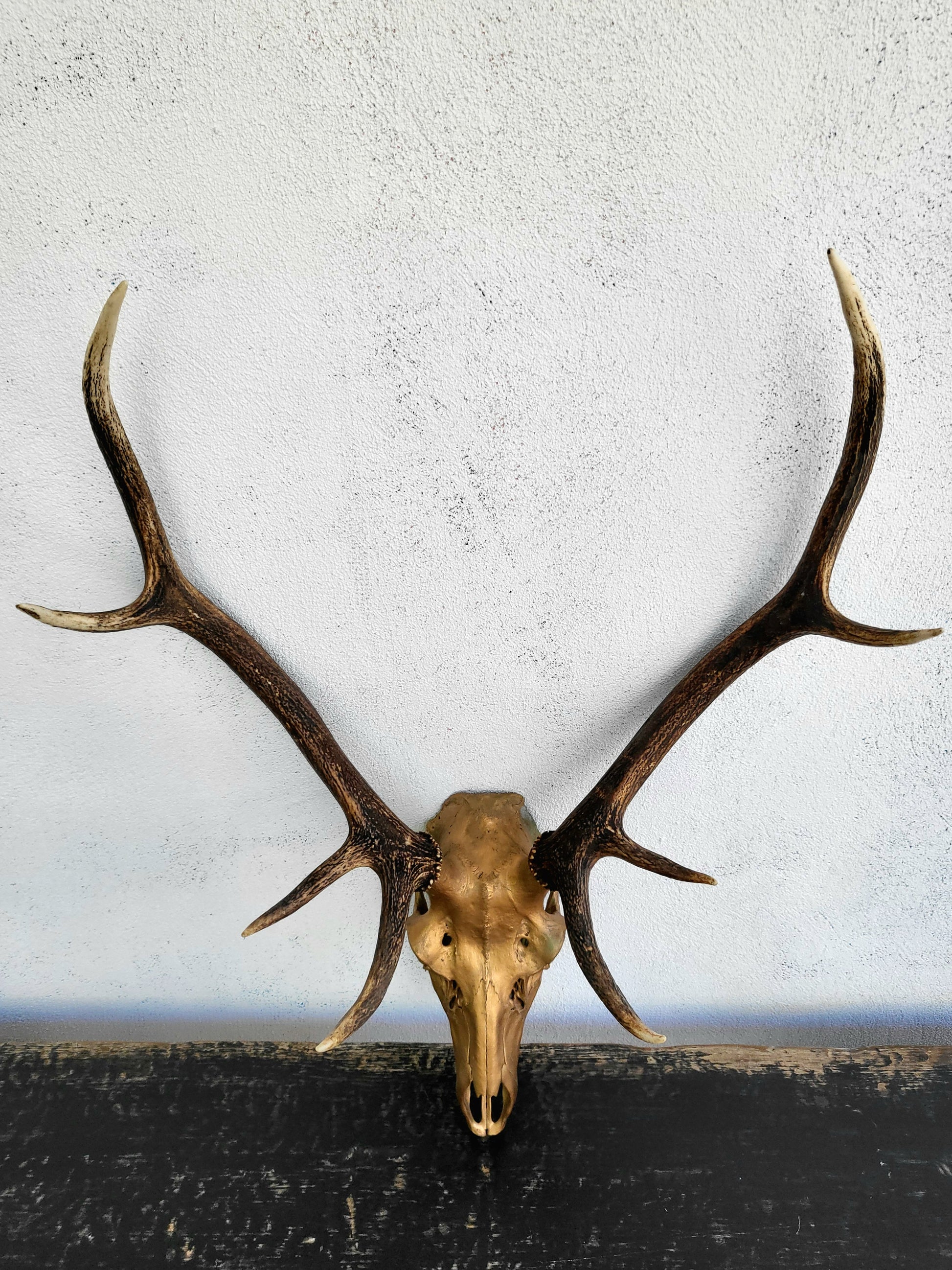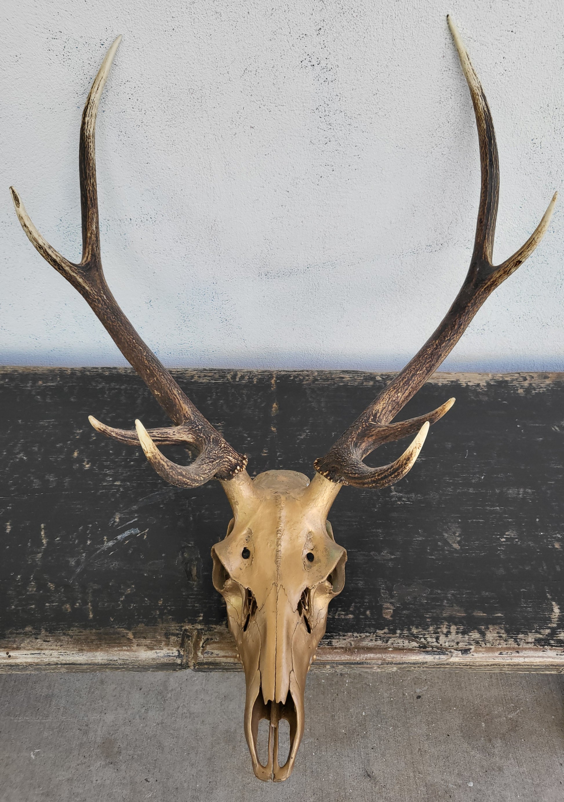 - Materials: Real deer skull and antlers, painted gold finish