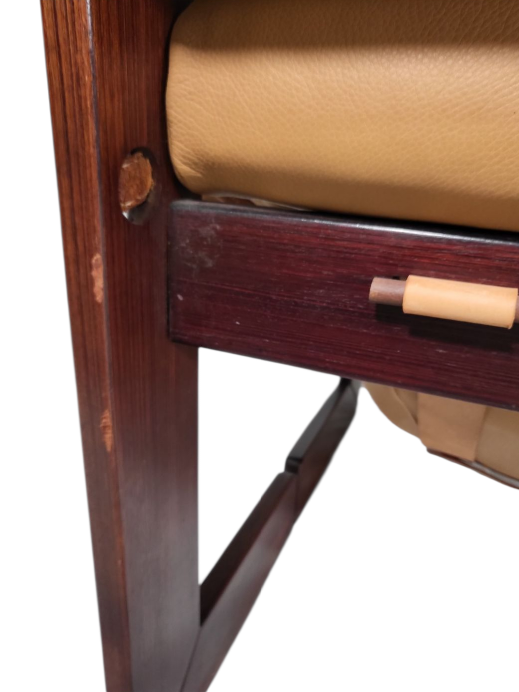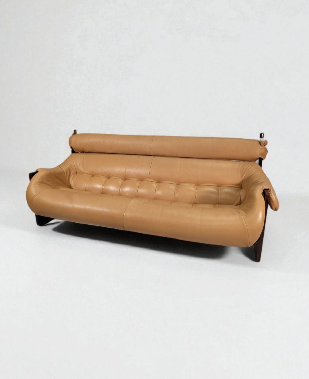 Crafted with precision in the 1970's for Lafer S.A., this three-seater sofa epitomises 'sexy' mid-century modern design, boasting a sleek rosewood frame paired with supple tan leather upholstery.