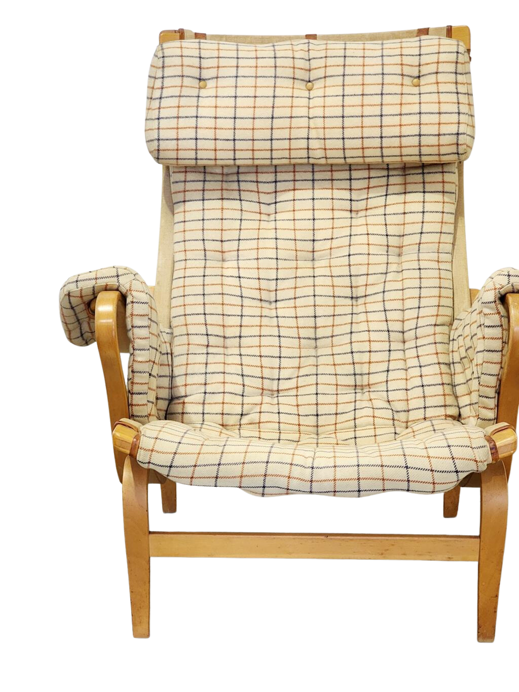 This iconic lounge chair, known as the Pernilla model, is crafted from bentwood and features its original canvas and cool, checked fabric. We are particularly enamoured with the chair's gracefully curved silhouette.