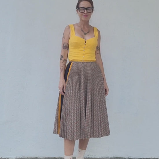 Crafted in a structured, quality fabric, this mid-length skirt features crisp pleats throughout, contrasted by bold black and mustard-yellow side panels that add unexpected modern flair. The silhouette moves beautifully with the body, creating a dynamic, sculptural effect with every step.