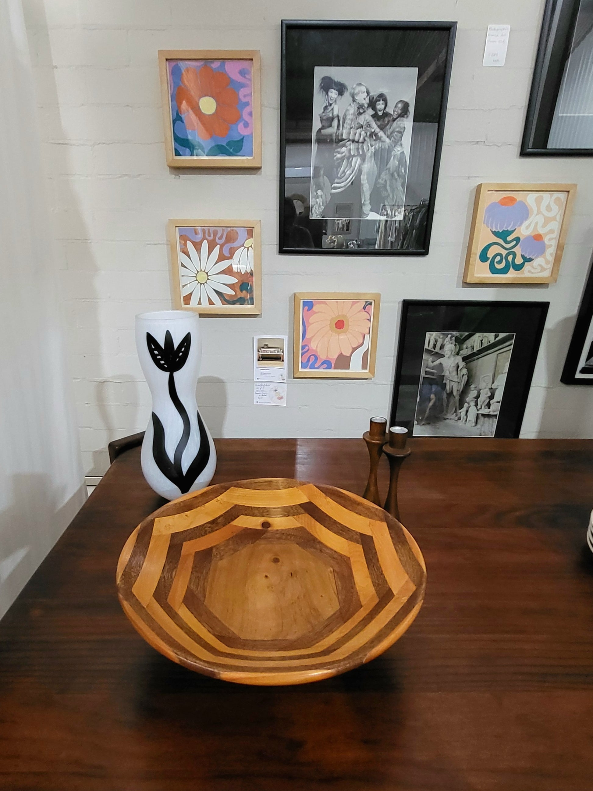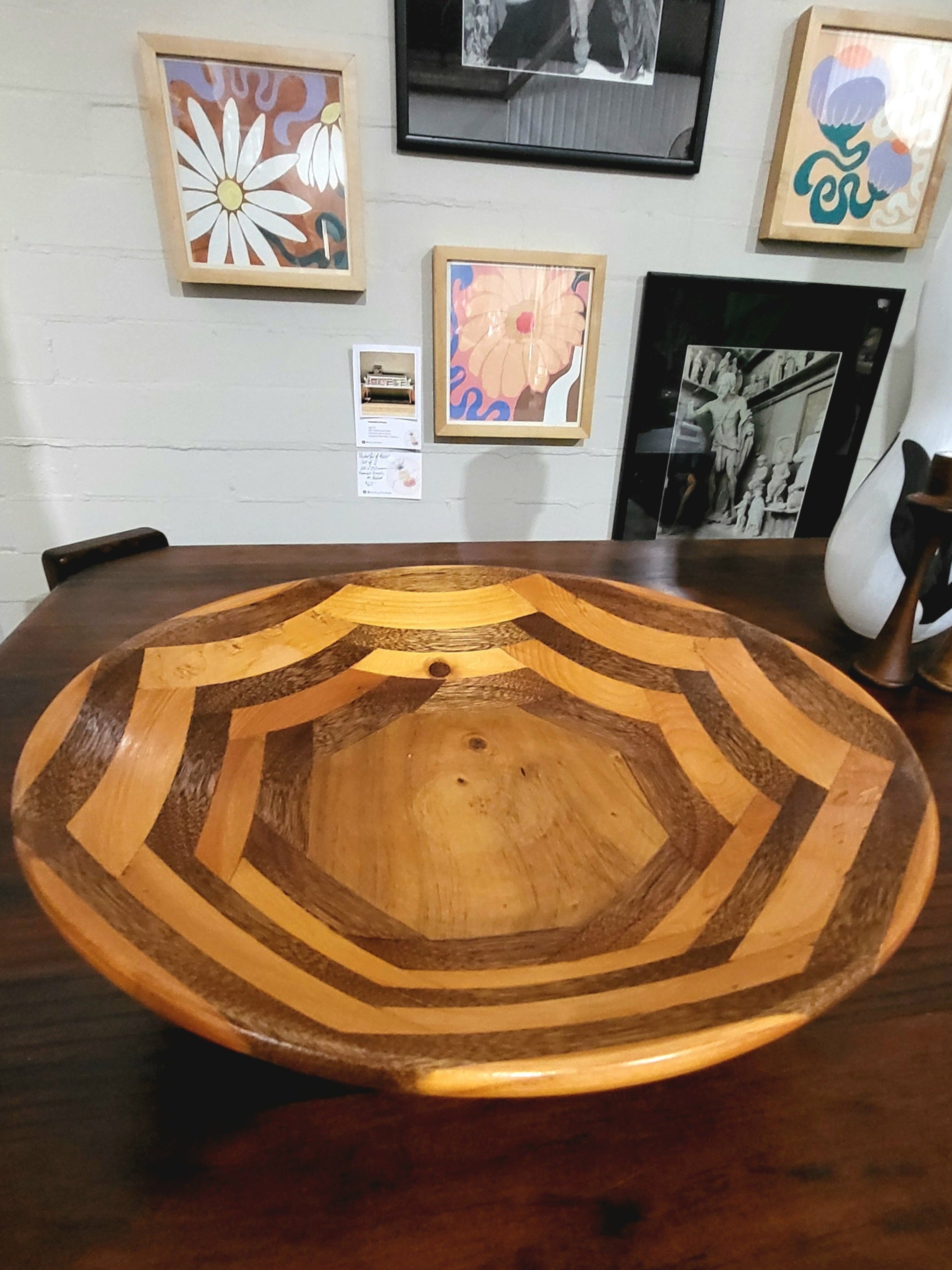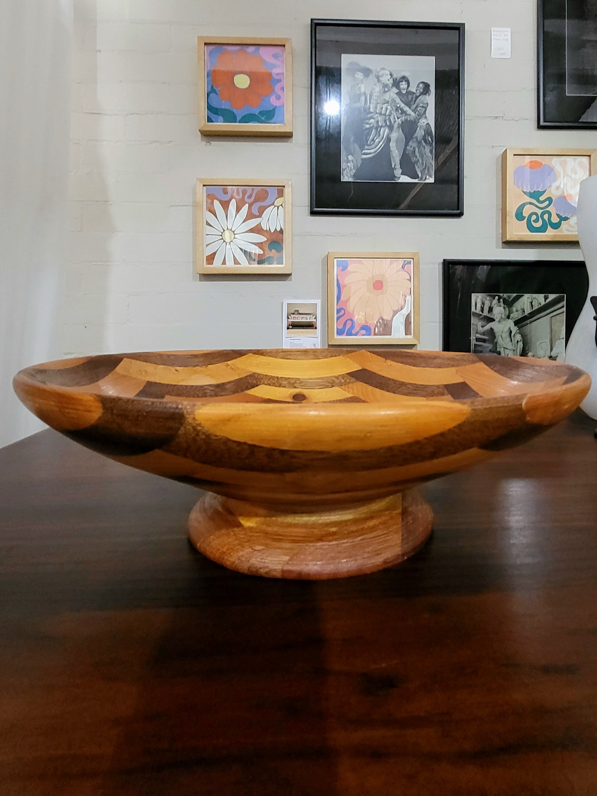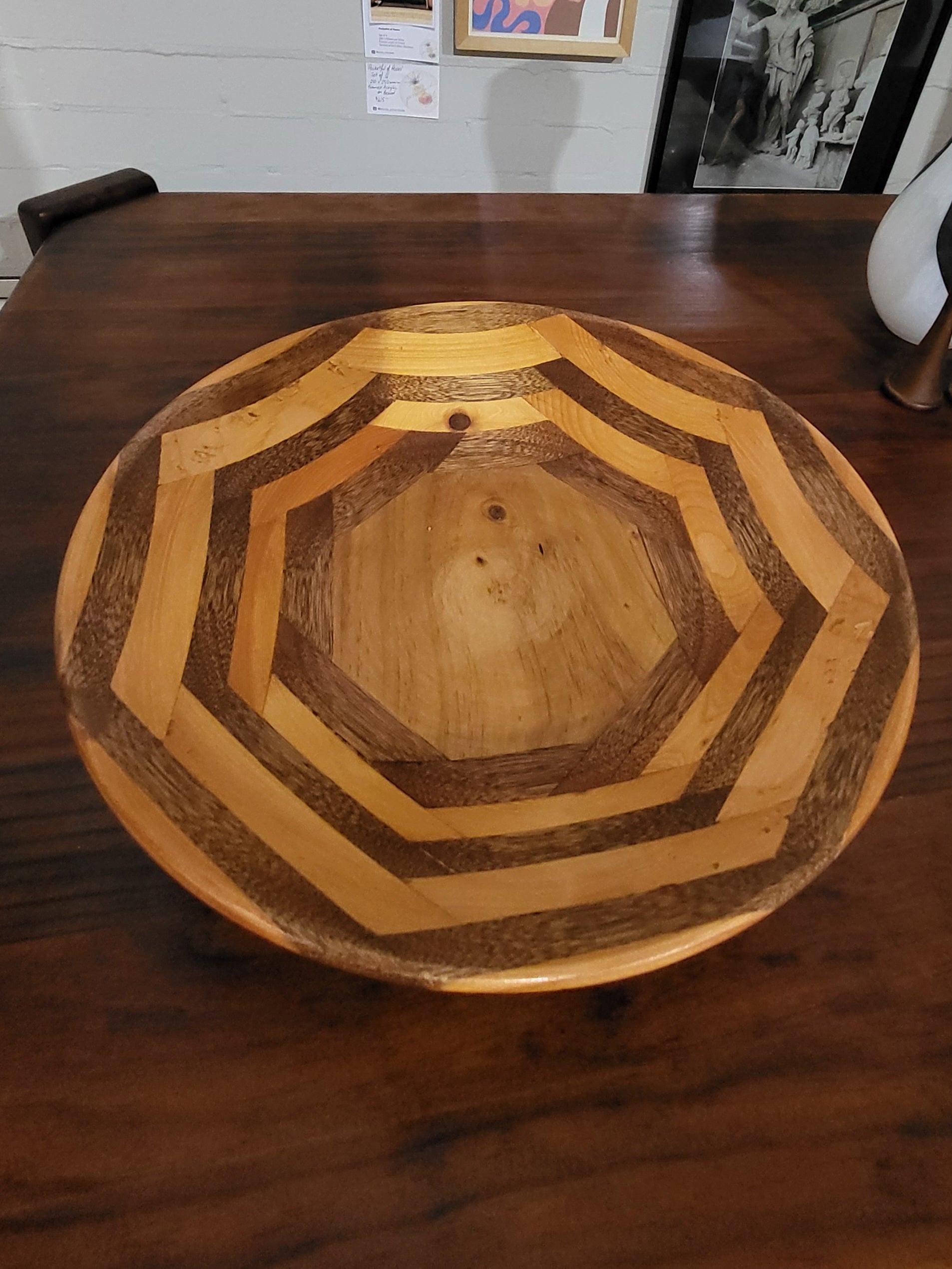A sculptural centrepiece crafted from richly toned wood, this large hand-turned bowl is a celebration of natural beauty and craftsmanship. The geometric patterning highlights the contrast between each timber segment, creating a striking yet organic aesthetic.