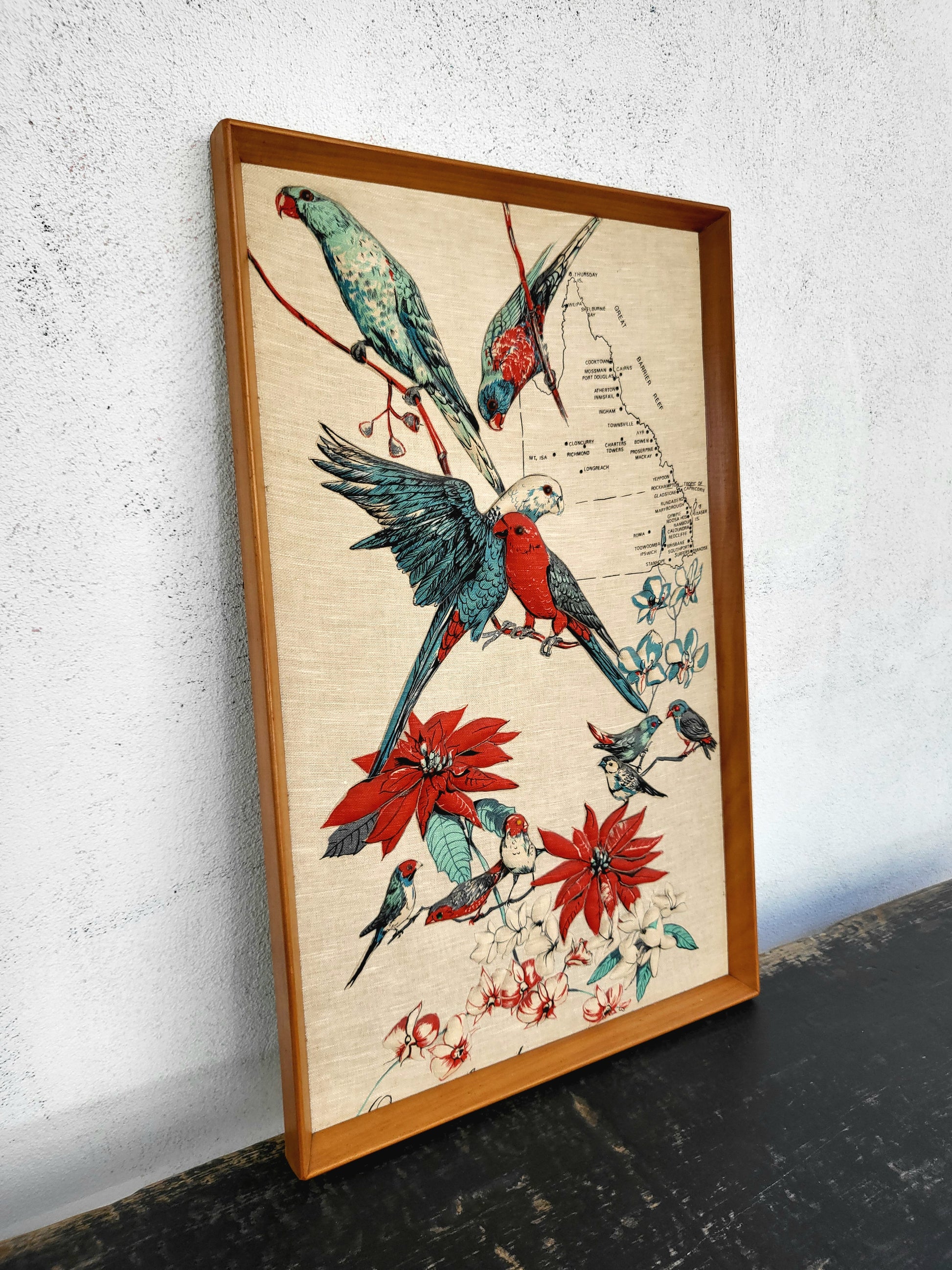 Vintage Framed Australian Birds & Flora Textile Art - Queensland Map