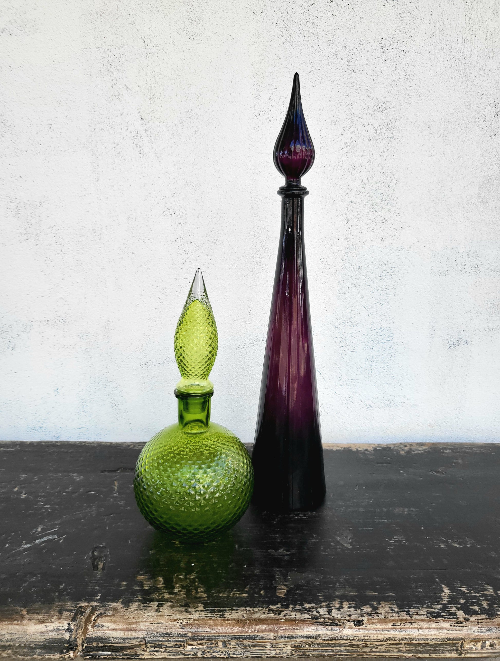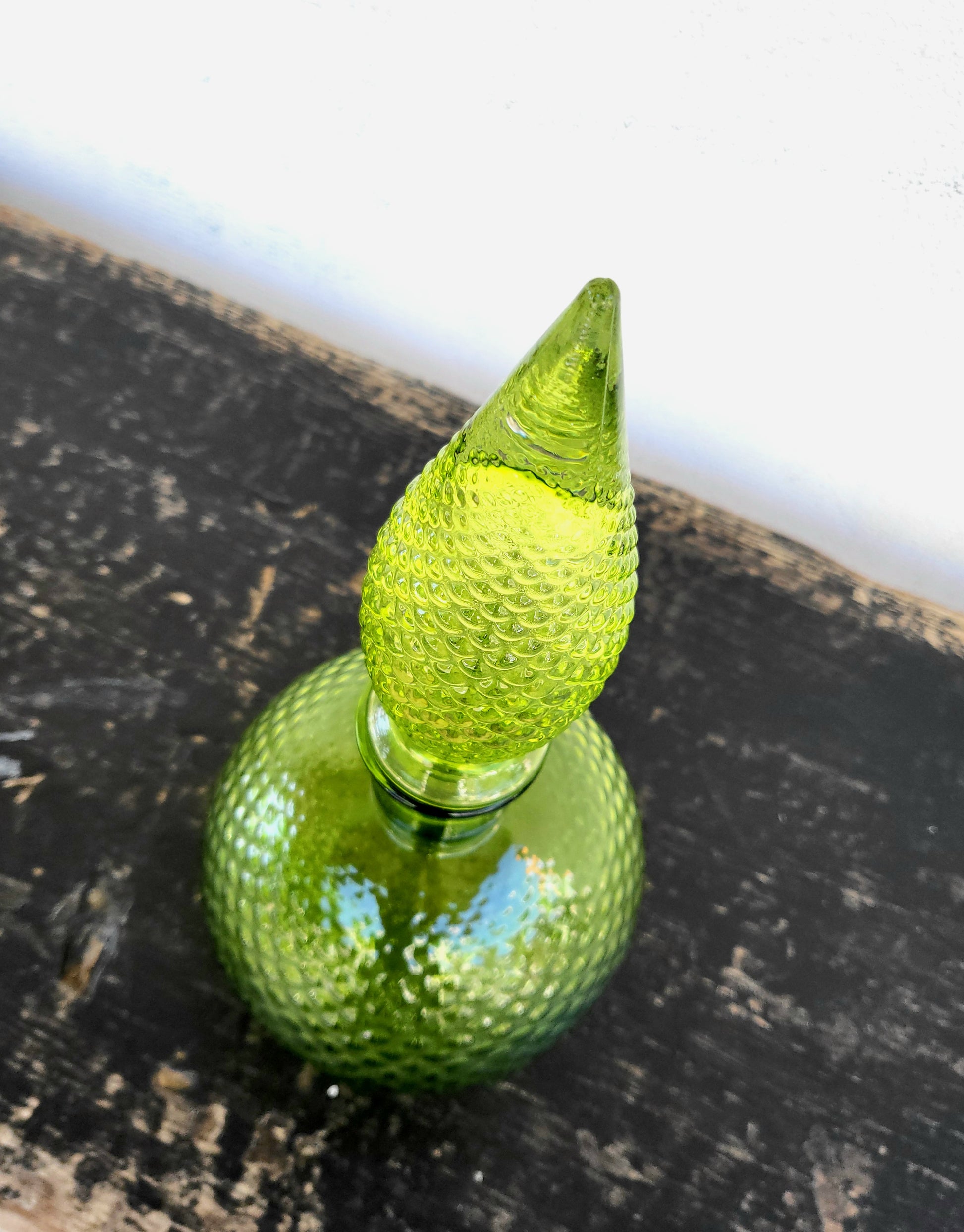 A true mid-century statement piece ✨ This vintage green genie bottle features a beautifully diamond-patterned hobnail texture and an elegant, elongated stopper.